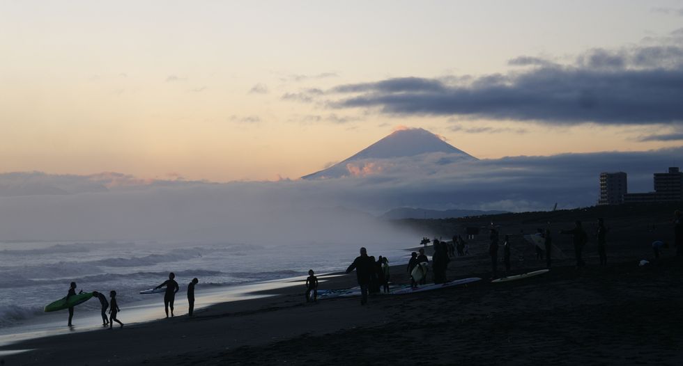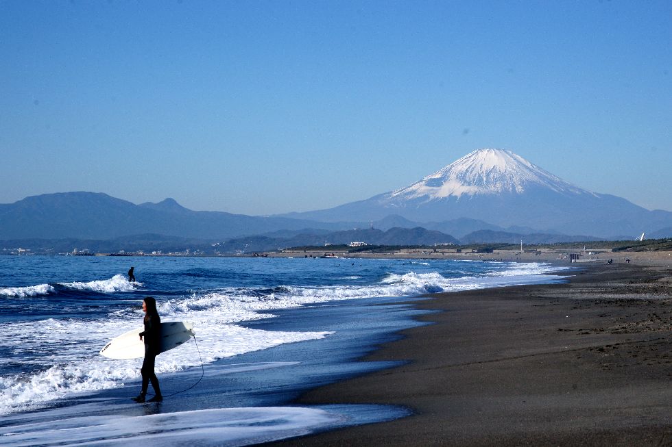 ちびっこサーファーと富士山いつも日曜日に開催のちびっこサーファー教室、今日は波が高いが全員元気にチャレンジ。 |
