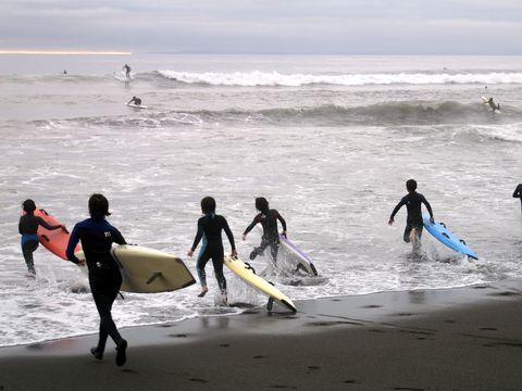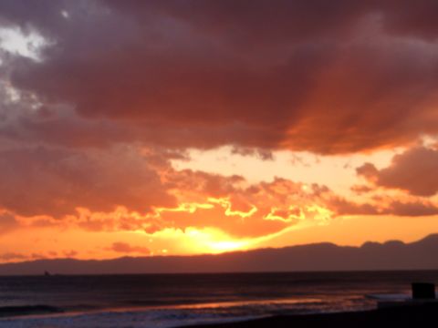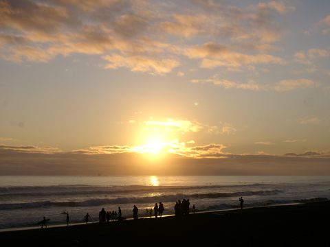 サーファー多数朝6時50分過ぎの初日の出を見る人で海岸は大賑わい、早朝でこんなに人が来るのは元旦の朝だけ。 |