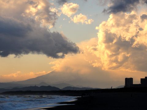海岸からの冬の富士山海岸まで行って久しぶりに綺麗な富士山を撮影、宝永火口のっずっと下の方まで雪で真っ白。 好天が続くと南側は早々に溶けるだとうけど。