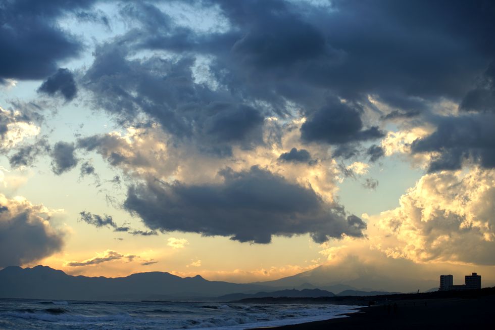 富士山は隠れて見えずその後、雨がパラパラしてきたので慌ててカメラをしまい傘をさす。直ぐに上がったので雲と海の隙間に太陽が沈むのが見えた。 強風で波が高い、公園のカラスはいつもは松の木をねぐらにしているが強風で北方向へ逃げて行った。 |