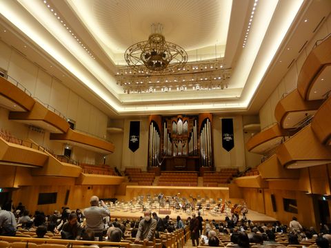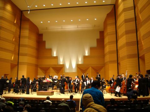 30分ほどだが結構賑わっている演奏は川越聡子、久しぶりに迫力ある演奏を楽しめた。最初2階席のサイドの席を選んだが、1階最前列に 空きがあったので移動。目の前のオケのスペースはガランとして普通とは違う感じ。 |