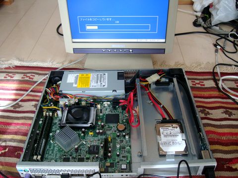 修理したPCの動作確認:XPインストール電解コンデンサ4個を交換したマザーのPC、動作確認のためWindowsXPをインストールし問題なし。 ただしRAIDカードは動作しているようがドライバが無いので抜いて確認。 |