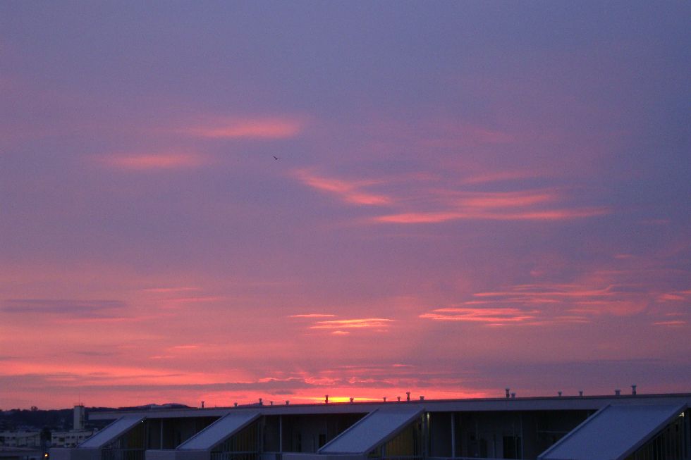 朝焼けの空今日は午前中から冷たい雨、日の出は太陽が隙間から見え赤く焼けたがすぐに厚い雲に隠れた。 |