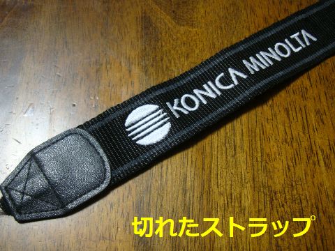 昨夕、デジタル一眼のストラップが切れた夕方の海岸の散歩中に切れた、砂浜だったのでカメラへのダメージなし、弱っていた接続部が千切れた。 手持ちのもう一段古いミノルタの物(国産)へ取り替えた。切れたコニミノのものは中国製だった。 |