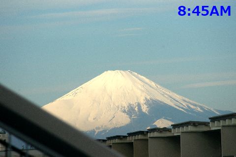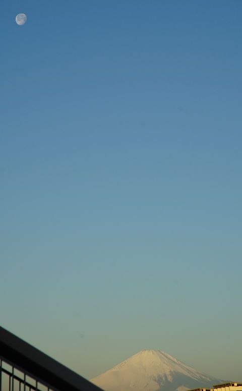 富士山と月の入り:8時10分頃月の沈むのは8時40分過ぎなので太陽の明るさに負けて段々と薄く見えなくなってゆく。 明日には山頂近くへ沈んでゆくが午前9時では太陽が明るくてほぼ見えないだろうけど。 |