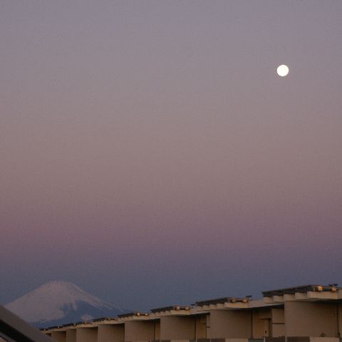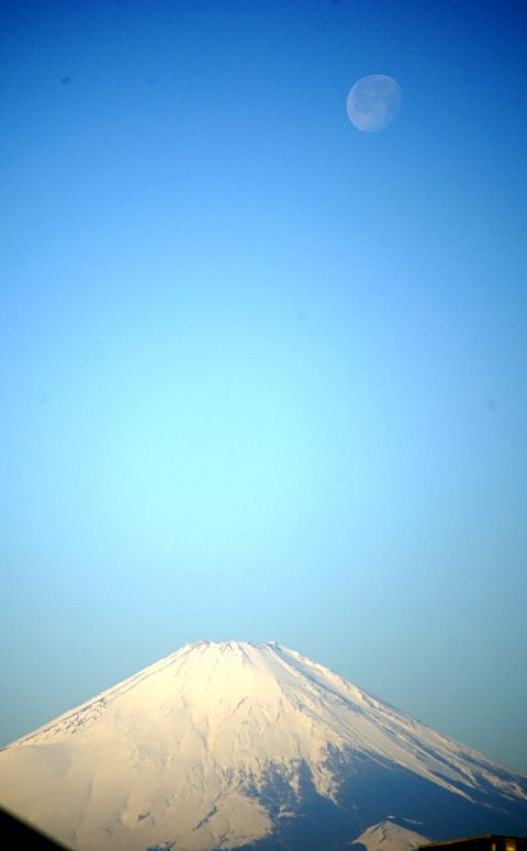 夜明けの月と富士山、撮ってみた日の出から時間が経たない西の空に見える満月、富士山とはまだ距離あり。 |