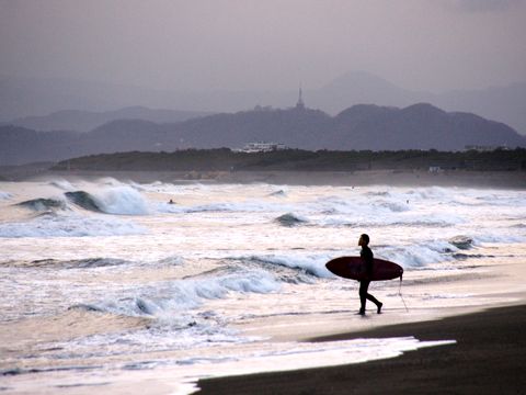 サーファーが多数今日は波もあって波頭が白く崩れるサーフィン日和。 |