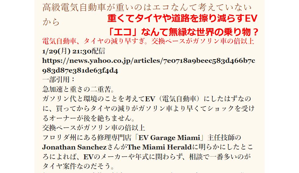 ちっともエコでないEVの実態電池性能の制約から(要は重い、充電時間が長い)エコで地球に優しいとは真逆な現在の技術で作るEV, 高価で金持ちは買うが、加速性能を売りとし更に電池を積んで重くなりタイヤの摩耗はエンジン車の倍、道路も 減り・痛みが倍?一体どこがエコなんだ? |