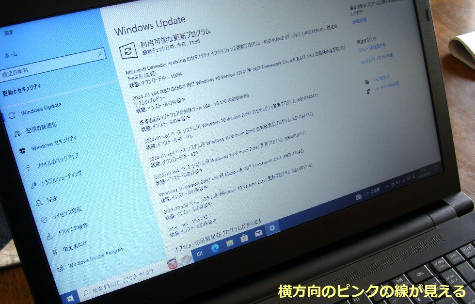 「液晶表示不良」:横に一本ピンクのラインがある不良、起動時に色がおかしい現象もあり