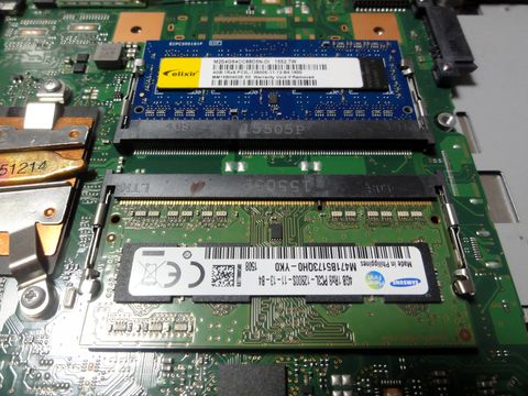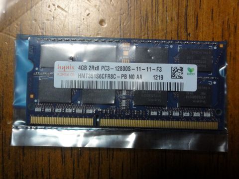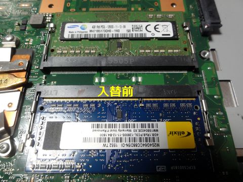 液晶表示不良のPC、念のためメモリ入替、変わらず表示用のメモリは通常のメモリの一部を使うので2つあるメモリモジュールを入れ替えてみたが変化なし。 やはり液晶モジュール自身の不良のよう、でも数分で横線1本だけの不良になるので実用上問題なし。 |