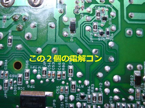 LEDシーリングの電解コンデンサ交換基板を取り出して交換するコンデンサを確認、ハンダ吸い取り線でハンダを除去し取り外し、新しいコンデンサを 取付、コンデンサがやや長いので金属カバーを完全にしめず緩めに固定して完了。 |