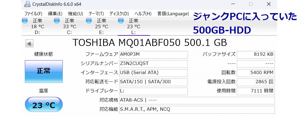 ジャンクノートの内蔵HDDをチェックしてみた使用時間も7111時間と短くまだまだ使えそう、とりあえずフォーマットして使用に備える。 |
