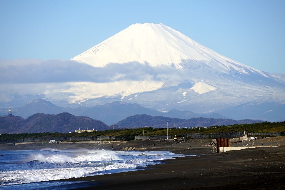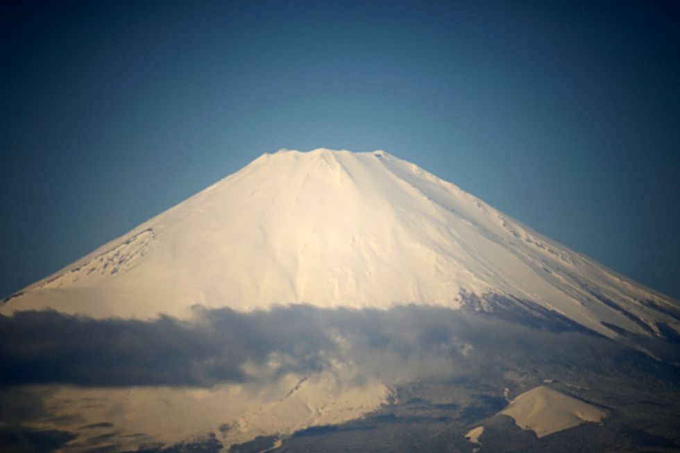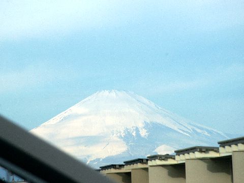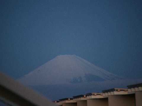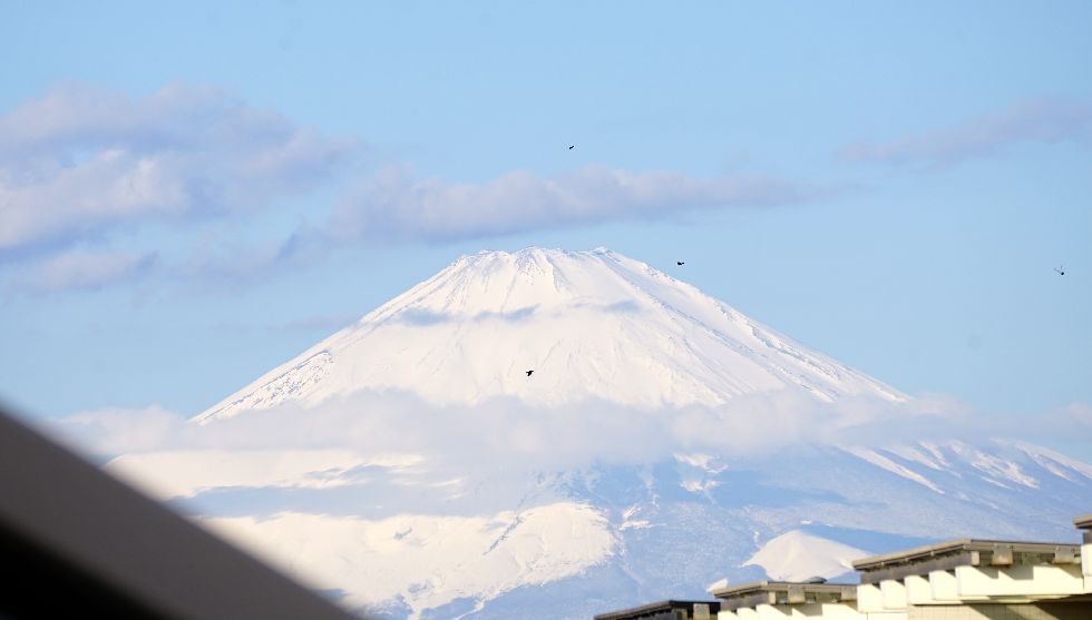 冬の富士山午前中は何とか見えた富士山、段々と雲が掛かり見えなくなってしまった。 富士山の手前に見える複数の黒い点は鳥。 |
