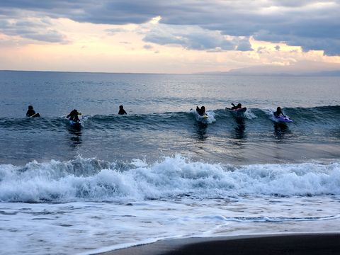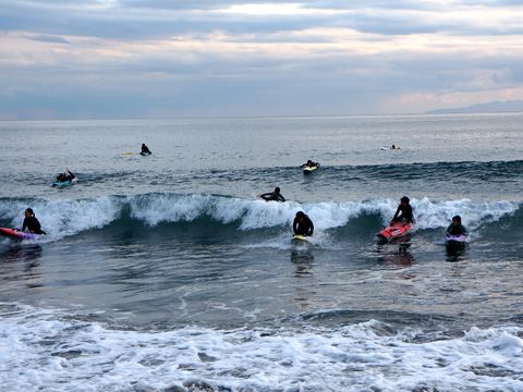 ちびっこサーフィン教室、頑張ってる毎日曜日のチビッコサーフィン教室、小学生位だが寒さに負けず果敢に波に挑戦している。 |