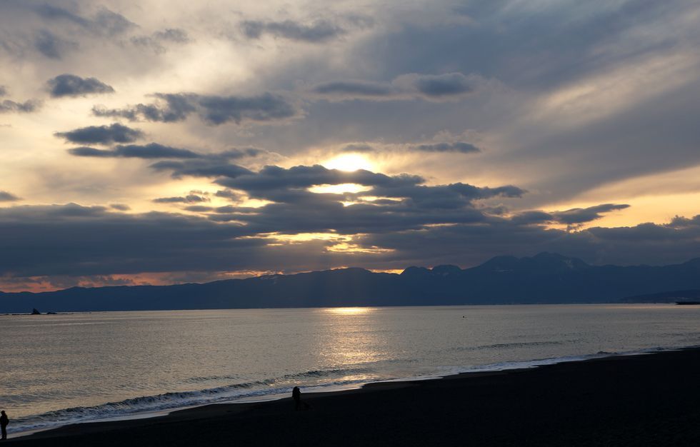 雲の多い夕暮れ富士山の姿は全く見えずの夕暮れだった。太陽の沈む位置は箱根の二子山あたりまで北進してきた。 |