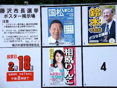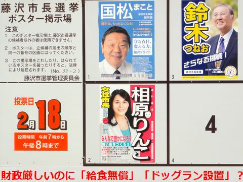 藤沢市長選、始まる駅前で自民党系の候補者が演説、犬を飼っているのでドッグランを作るだの、給食無償化などバラマキ政策が4多数。 財政厳しく霊園の増築工事さえ中止とする状況でよく言うなと呆れるしかない。 |