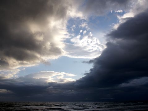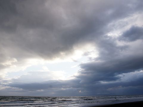 「春一番」の強風で高波強い南風で高い波が押し寄せる海岸、雲が厚く太陽は見えない。 |
