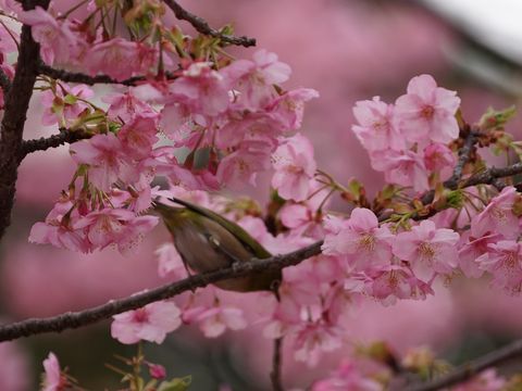 メジロと河津桜@江ノ島頻繁に動き回るメジロにきちんとピントを合わせるのは至難の業、前後左右に桜の花が多数ありピントが変な場所に 行ってしまうから、何か対策はあるのかな。動き回るためマニュアルでは間に合わないという気もする。 |