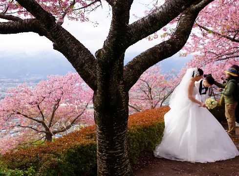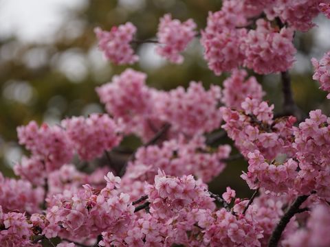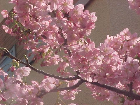 一部の木はもう満開江の島山頂の河津桜は一部を除いてもう満開に近い開花状況、平日だが中国人観光客が多数。 |