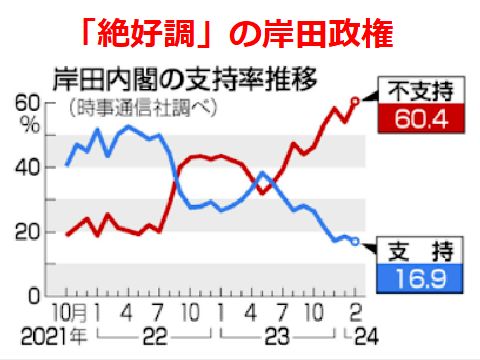 支持率16%台に低下するも「増税メガネ」と揶揄される岸田首相、裏金問題で替われる人もいなので「続投」、「やけっぱち解散」する との予想もあるが。 |