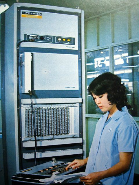まだ高価で導入される場所は限られたモディコン社と販売提携したSCA形は10数台しか売れなかったがPROSECになって300台以上販売したはず、 専売公社や浄水場・下水処理場の制御に多く用いられた。写っている女性は工場の庶務の人、今では個人情報でとても考えられないけど。 |