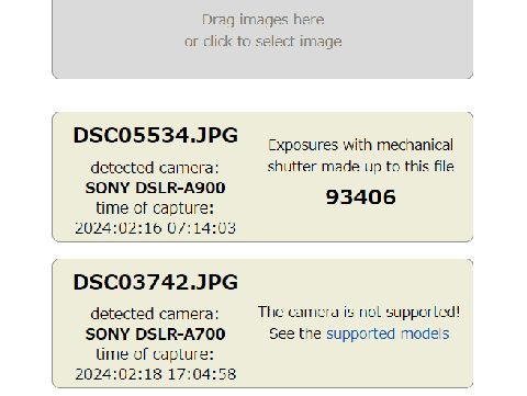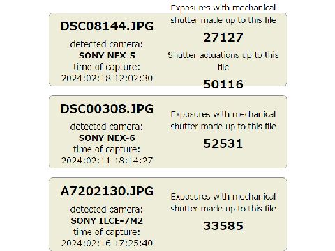 カメラのシャッター動作回数を調べてみたミラー脱落のα900は9万回越え(でも耐久10万回なので脱落は品質でアウト)、ミラーレス機もすべて中古購入なので 回数はそこそこ行っている。入手後の撮影枚数ではα7Uが27000、α900で29000、NEX6で41000, NEX5で18000程。 |