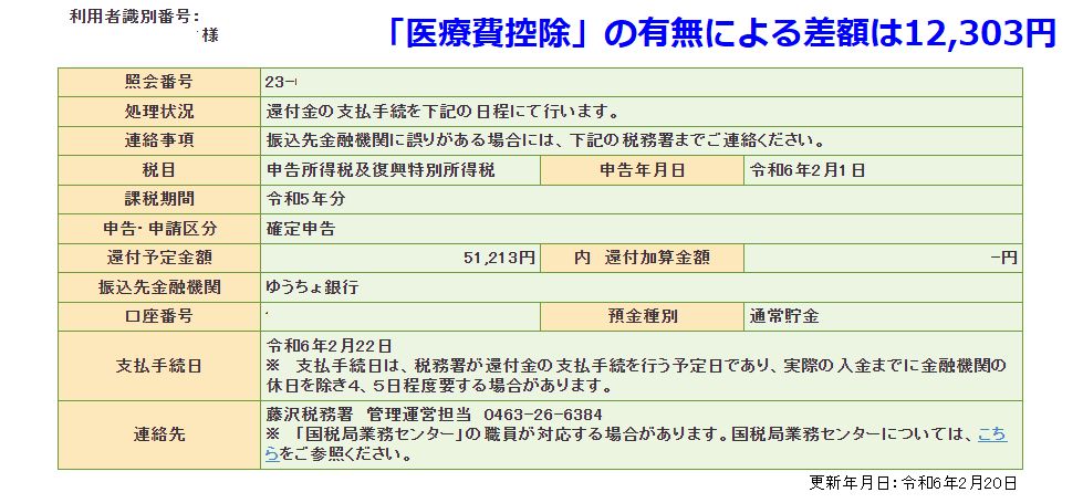 令和5年分確定申告を完了医療費の修正で手間取っていたが、ようやく修正して送信完了となった。医療費控除の追加で還付額が12,303円増となった。 |
