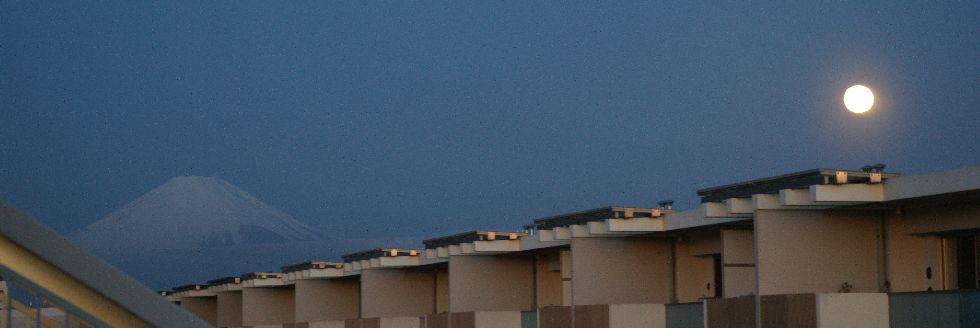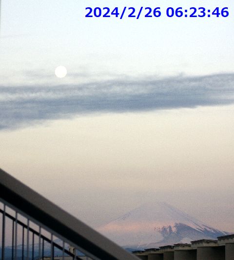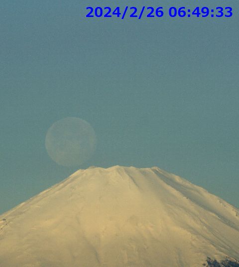 薄いけどパール富士に朝7時前なので曇りとはいえ太陽光の明るさに負けて薄くなってしまった月、富士山頂へ沈んでゆく。 |
