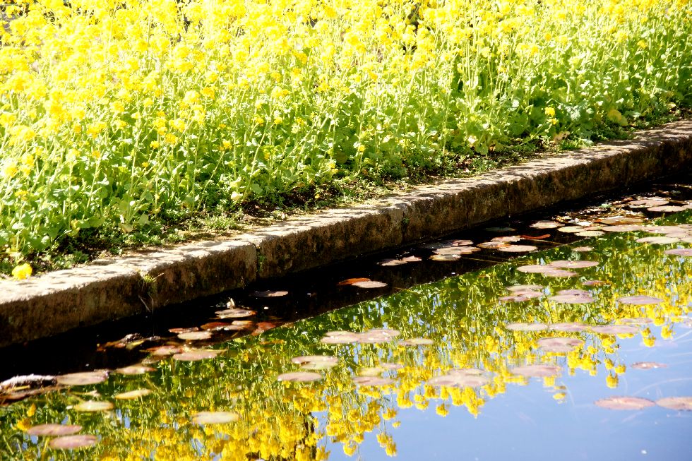 菜の花が池に映えて