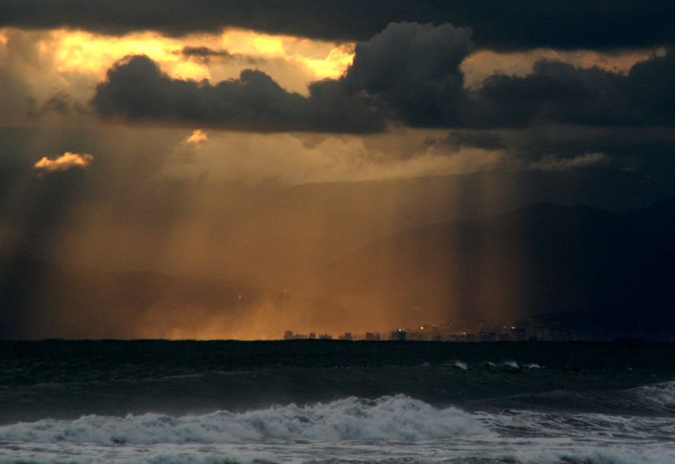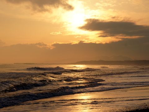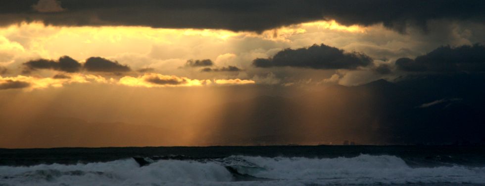 陽光降り注ぐ海岸夕景一番輝いて見えるのは小田原あたりのよう、幅広く陽光が雲間から降り注いでいる情景。