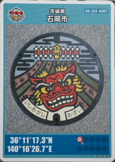 石岡のマンホールカードをゲット駅から750mほどの場所にある観光施設・丁子屋でカード配布、カラーマンホールは街の あちこちにあった(指定のものは少し先の神社前だが)。 |