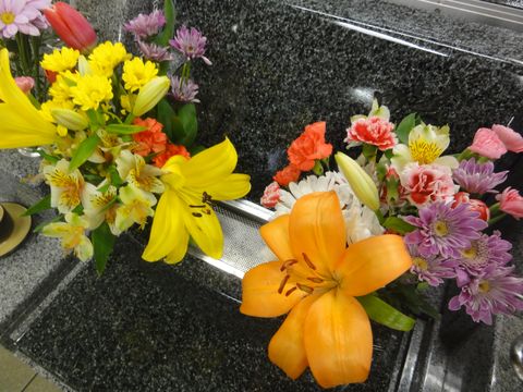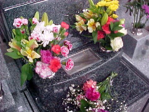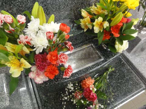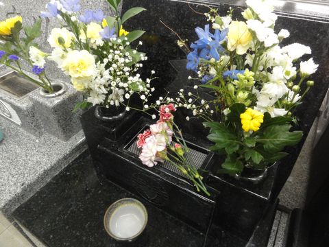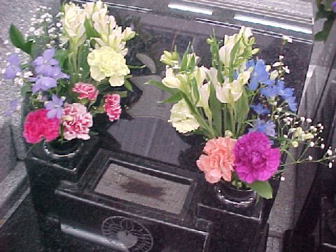 3週間目の墓参りにまだまだ花は長持ち中、防腐剤の効果もあるようだが何といっても寒いので長持ち、とくにカーネーション。 |