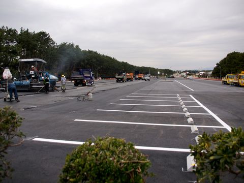 公園駐車場は舗装工事・ライン引き中駐車場内にあった植え込みはすべて撤去し横一列の長いスペースへと変更に、駐車可能台数が増えるのだろうけど。 |