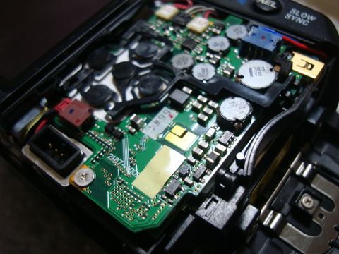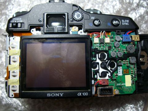 α100、ちょっとバラしてみたが背面側に見えるネジをとると裏側カバーが外れるとあったので、やってみた。確かに簡単に背面内部がアクセスできる。 CFスロットの基盤にアクセスするには右側の基板を外す必要あり、ここまでで中止し元に戻した。 |