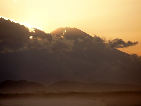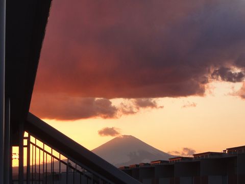 西の空は異様な感じに橙色の夕焼けに雲が交じり異様な感じの空だった、まだ富士山には遠いので富士山は普通の色のまま。 |