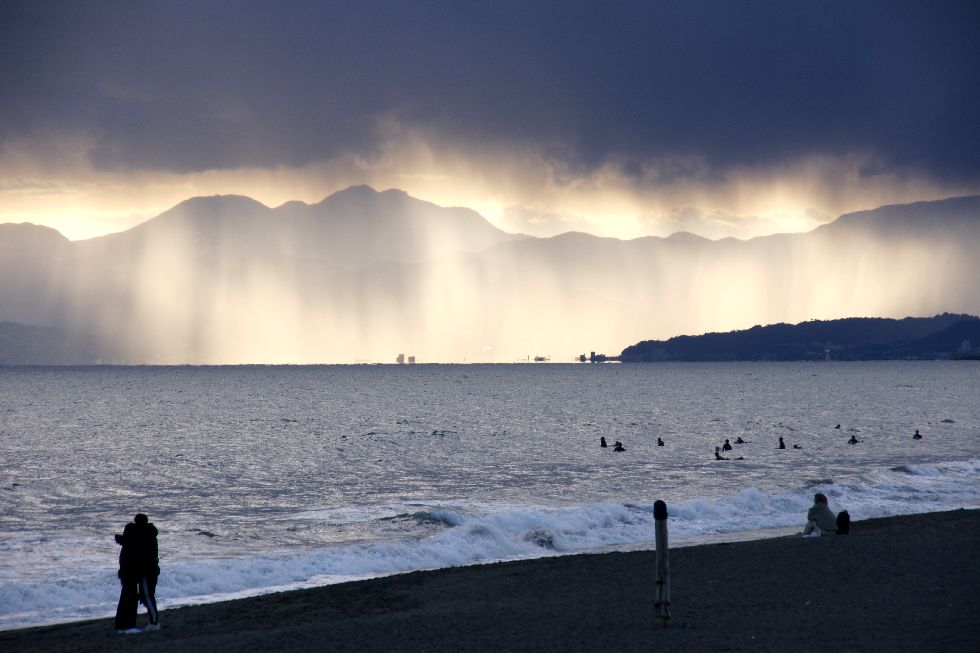 雲間からさす光で浮き上がって見える太陽光が雲間から降り注ぎ、小田原方面の建物が浮かび上がって見えている。 |