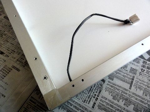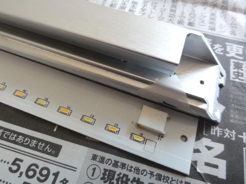 再度分解、複雑で組み立て難い構造断面構造が分かったので再度分解、4辺のうちの2辺にLEDチップの基板が入っていて、それをプラグ配線で 繋ぐという構造。アルミチャネルを使っているが直角が出しにくく組立て性は非常に悪い。 |