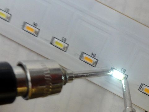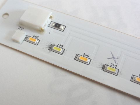 不良のLEDを見付け短絡したが定電圧電源でLED一つづつ電圧印可し不良の素子を探す、白色が一個付かないのを発見し短絡処置。 組み立てるも接続不良か、一部しか点灯しない、コネクタ接触あるいは断線かも、修理は中断。 |