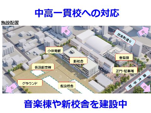 工事完了後の姿校舎棟を一棟壊して新教室棟に、旧本館跡地には音楽棟が作られる、建替え中はグラウンドに仮設校舎が。秋の学校祭は どうするんだろう。 |