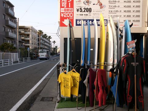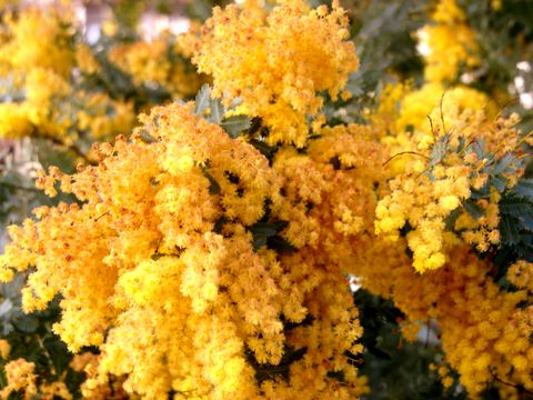 ミモザが綺麗に咲いている散歩の帰路に見つけた満開のミモザの花、いつものサーフショップの店舗前の風景もスナップ。 |