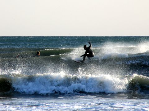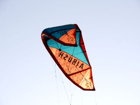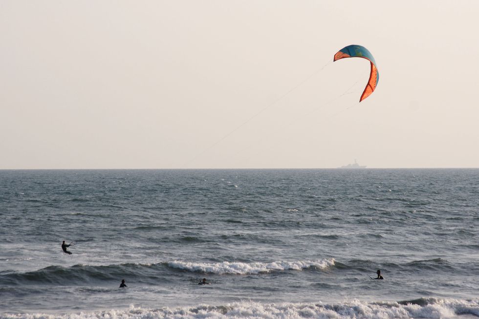 海岸ではカイトサーフィンをする人大きなカイトで風を受けて左右に滑っている気持ちよさそうなスポ―ツだが大変そう。 |