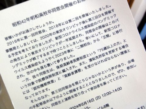 高校の同窓会の案内が来たがコロナ禍で3回目の開催が延びていたそうだが今年6月開催との案内がきた(幹事はご苦労さまだが)。 遂に会費が1万円に!往復の旅費も含めると3万円コース、集まるメンバーも変わり映えしないので参加の意欲は小さい。 |