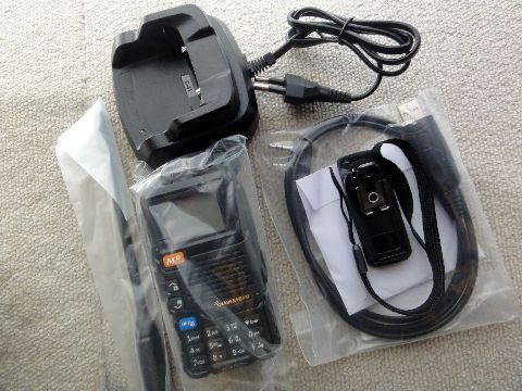 中華トランシーバが届いた21日配達予定となっていたが2日早く届いた、さっそく開けて動作確認し問題なさそう。 下は付属品を含めた全体、プログラミング用のケーブルを頼んだので一緒にいれてあった(ドライバCDも付属)。 |