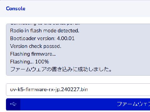 購入したUSBシリアルケーブルでPCと接続、書き込みモードにしたトランシーバにブラウザから書き込みして 日本語化+送信禁止のファームウェアへ入替え。便利になったもので書き込み内容のダウンロードや書き込みソフトも一切不要で ブラウザから完了できる、世の中進歩してる。 |
