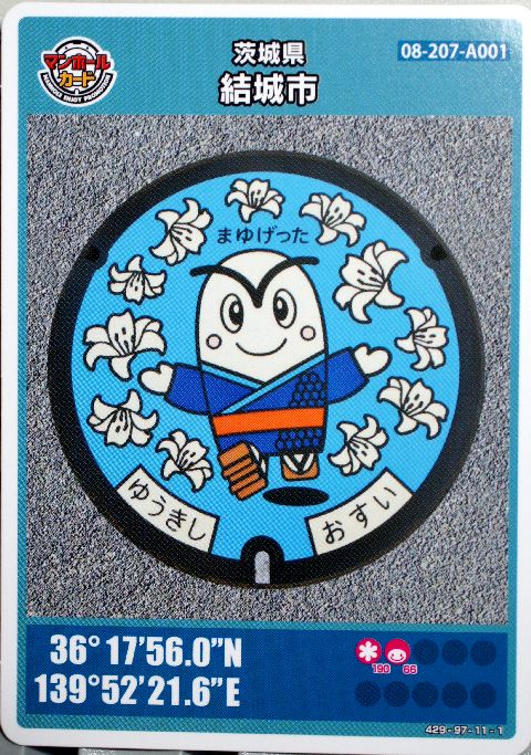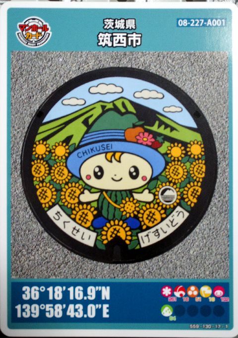 マンホールカード:筑西市駅前にある元ショッピングビルに入居の市役所・下水道課で入手、元がショッピング施設で使い勝手が良くなさそう。 地元商店街の反対で駅前のペデスタル歩道橋は市役所へ直結せず、地上へ降り1階から入るというバカな構造。 |