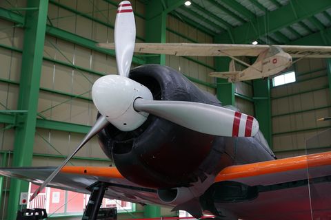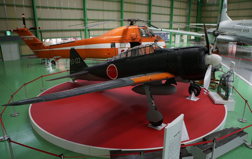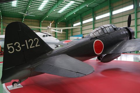 零式戦闘機(複座)もう一つの目玉展示、ゼロ戦、回収した複数の機材から復元した機体との事だが綺麗。 |