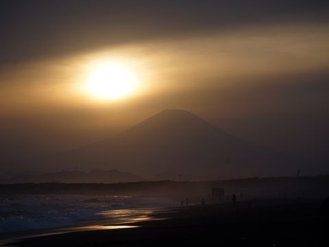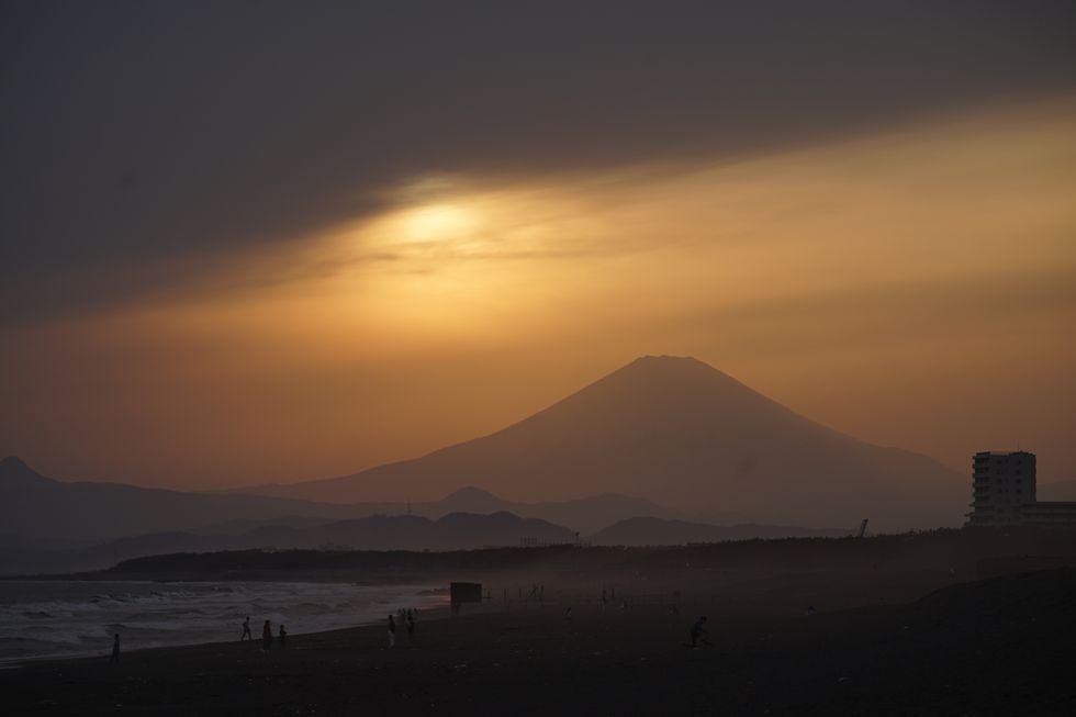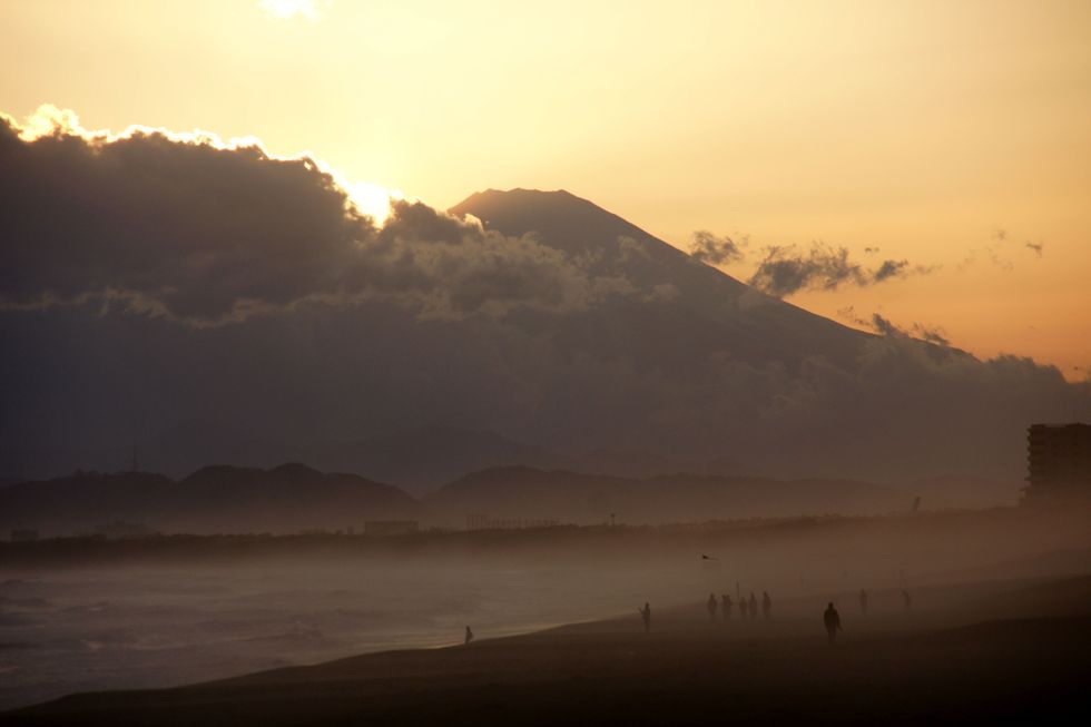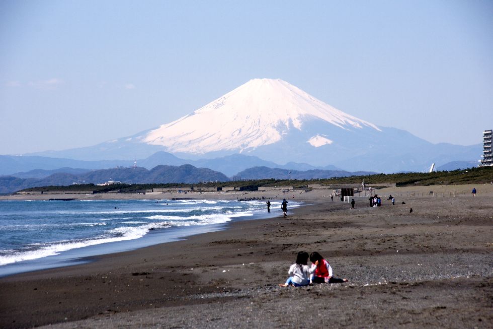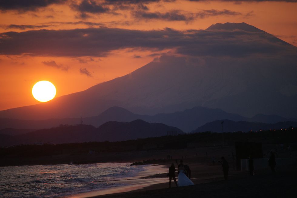 ダイヤモンド富士も近づいた波打ち際では結婚式の前撮りをしている人たちもいたが寒そうだった。来週は悪天候で富士山の綺麗な姿を見るのは難しそう。 |