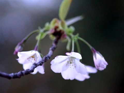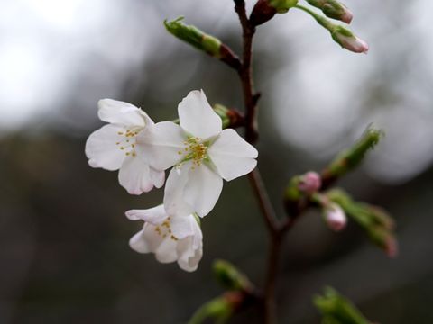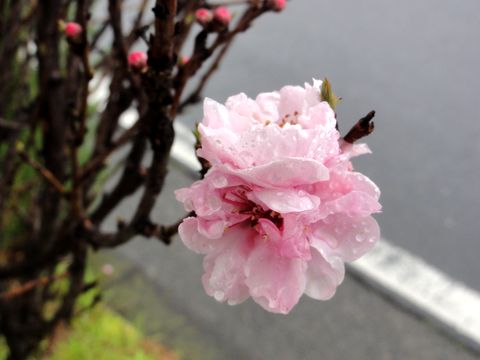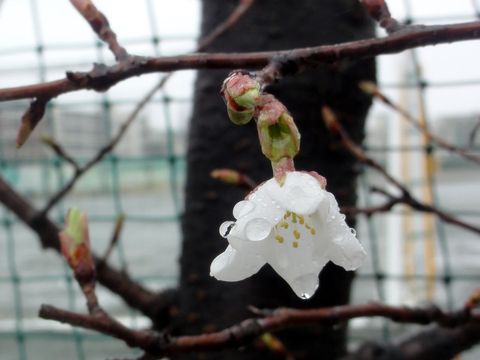 一輪咲く桜を発見冷たい雨の中、たった一輪だが開花、まわりの蕾も赤みが増して数日中には開花しそうな感じ。 |