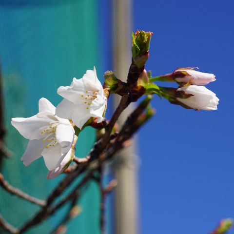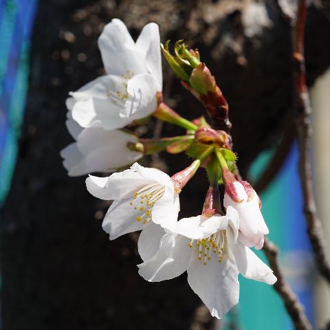 桜の花たちもう5−6輪は咲いている、この木は若い桜の木のよう。 |