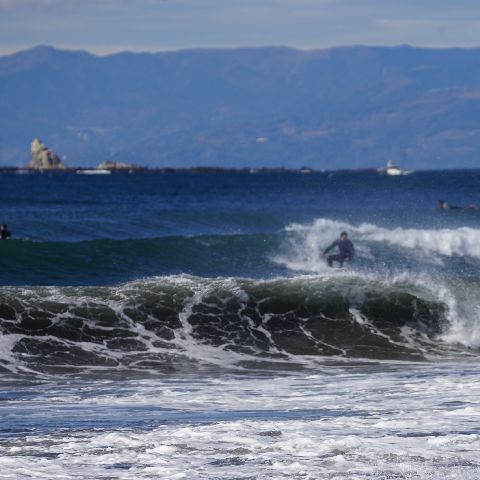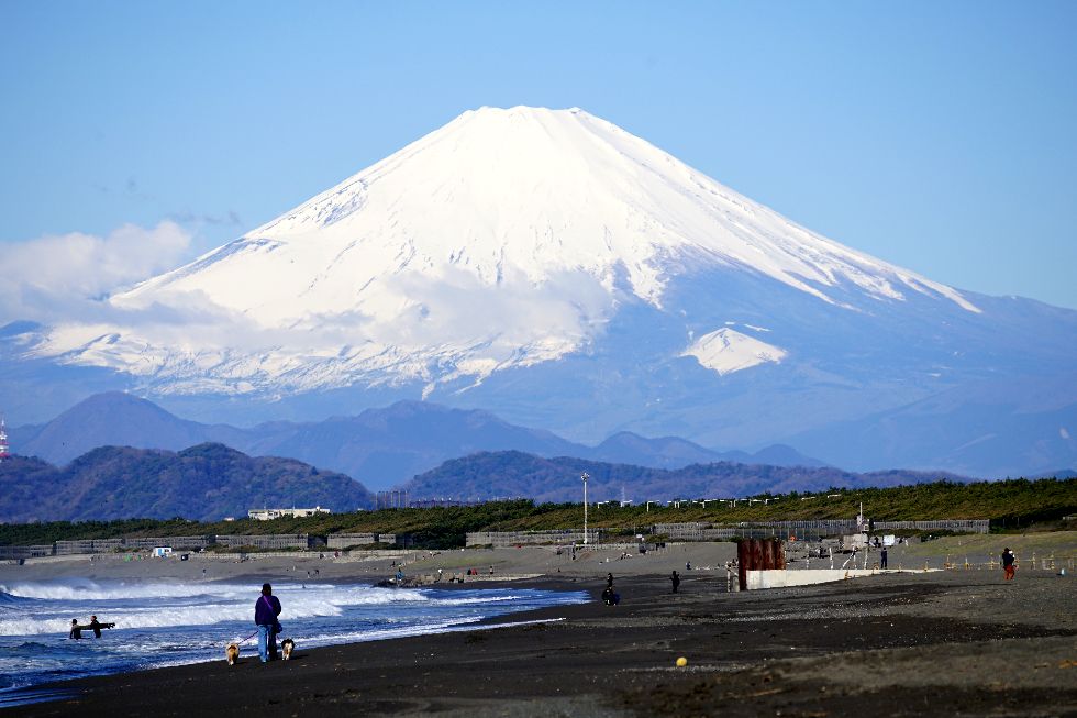冬らしい綺麗な富士山お昼過ぎに海岸へ散歩に、波が高くサーファーは少ない。富士山は雪が飛んでいるのか雲が掛かっているのか? |